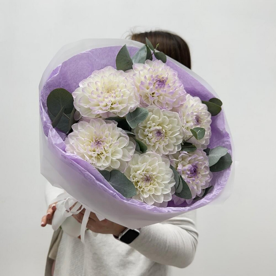 Букет из 7 бело-лиловых георгин с эвкалиптом в Калуге