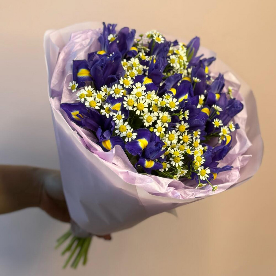 На фото букет из ирисов и ромашек. В составе: ирис 11 шт, танацетум 6 шт, дизайнерская упаковка 2 шт, атласная лента 1 шт, . Все цветы свежие и ароматные, букет красиво оформлен и отлично подходит для подарка. Доступна доставка цветов или самовывоз.