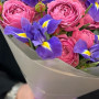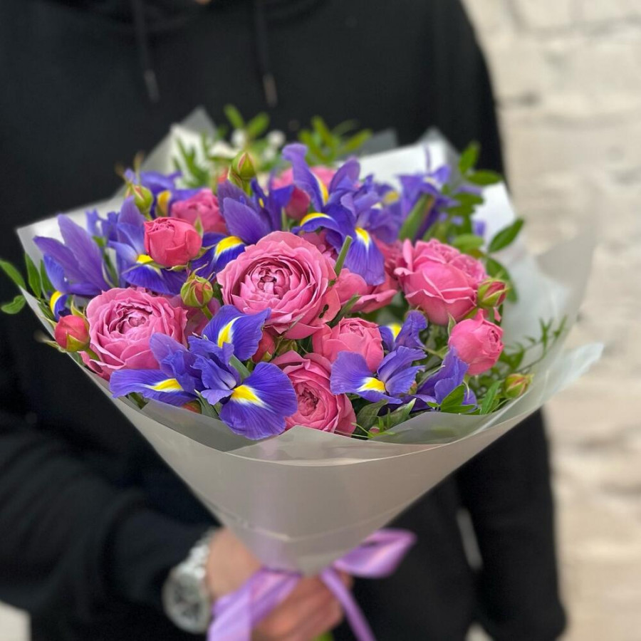 Букет из розовых пионовидных роз и синих ирисов в Калуге