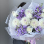 На фото букет «сиреневое облако». В составе: георгина 5 шт, маттиола 4 шт, гвоздика 5 шт, дизайнерская упаковка 1 шт, атласная лента 1 шт, . Все цветы свежие и ароматные, букет красиво оформлен и отлично подходит для подарка. Доступна доставка цветов или самовывоз.